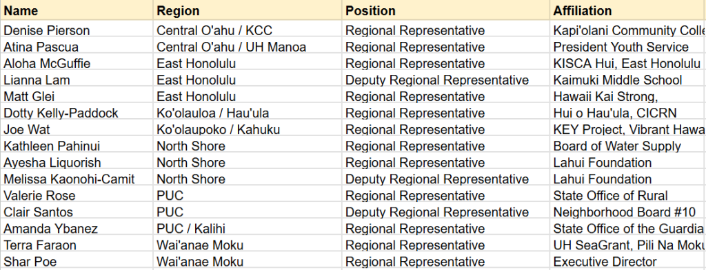 Our leadership team is made up of members from each sustainable planning region or ahupua’a with a 1 year commitment.
